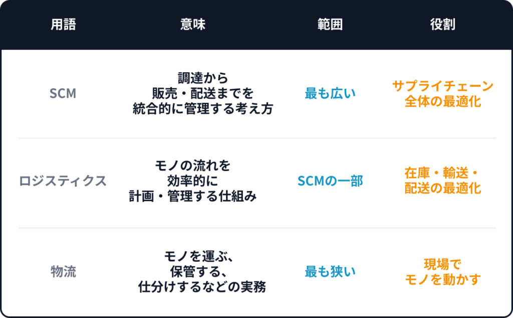 簡単に言えば、SCMが“設計図”で、ロジスティクスは“実行手段”です。